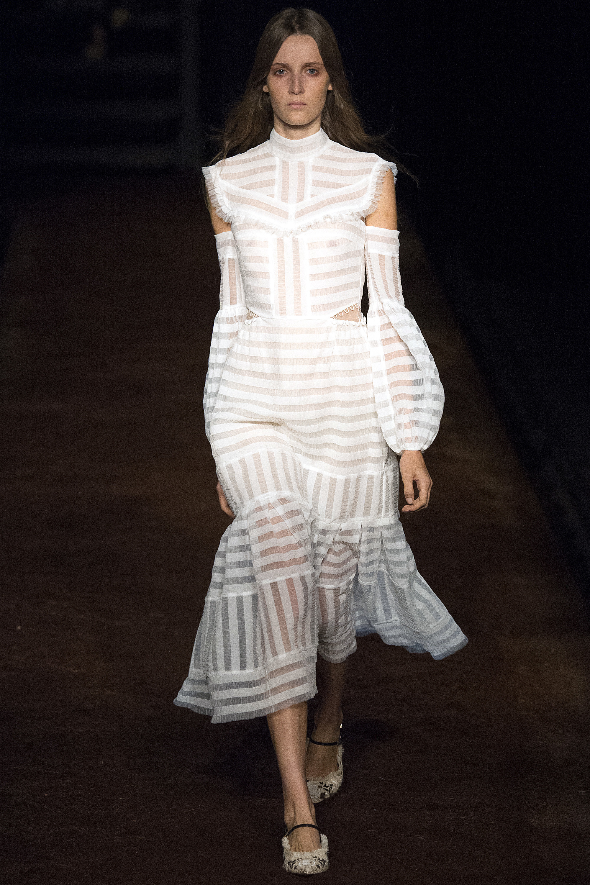 The collection was pure prairie girl meets childish Victoriana with its ditsy floral prints, high necklines, lots of ruffles and light pastel colours that invoked a Victorian summer garden. While not as pretty as his usual offerings, Erdem MoralıoÄŸlu gave us something darker and moodier, but also something much more interesting. There’s an edge we’ve never seen before in his works and that’s why this show was so enthralling to watch and even more beautiful in person.
